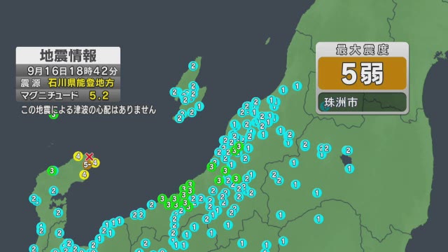 9月16日18時42分頃石川県で最大震度5弱を観測する地震がありましたこの地震による津波の心配はありません 震源地石川県能登地方. NHK 石川県のニュースNHK NEWS WEB.