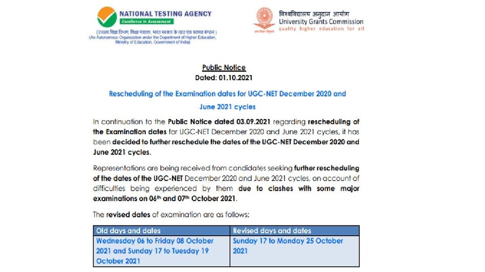 NTA Reschedules UGC NET Check New Dates Here UGC NET 2021 has been rescheduled due to clashes with some major exams on October 6 and 7 2021. UGC NET 2021. We wish you all the best for your examination.